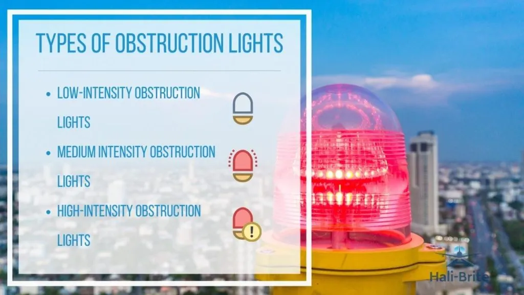 - Medium Intensity Obstruction Lights: There are two types of medium intensity lights – the flashing red L-864 and the flashing white L-865. They are mostly used with obstructions ranging in height from 344.4 to 492 feet (or 105 to 150 meters).